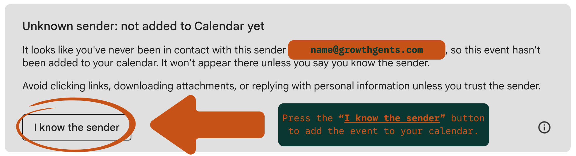 IMPORTANT: The ''invitation from unknown sender'' email may give the option to click 'I know the sender' instead of 'Add to calendar'. If this is the case, please click 'I know the sender' button.